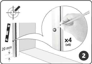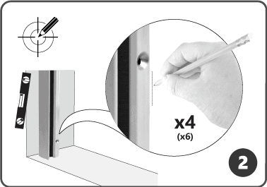 Placer skærmen på installationsstedet. Markér stederne for at bore huller til skruerne (hvis nødvendigt). Kontrollér med et vaterpas, at skærmens sidestyr er i det rigtige niveau (anbefales).